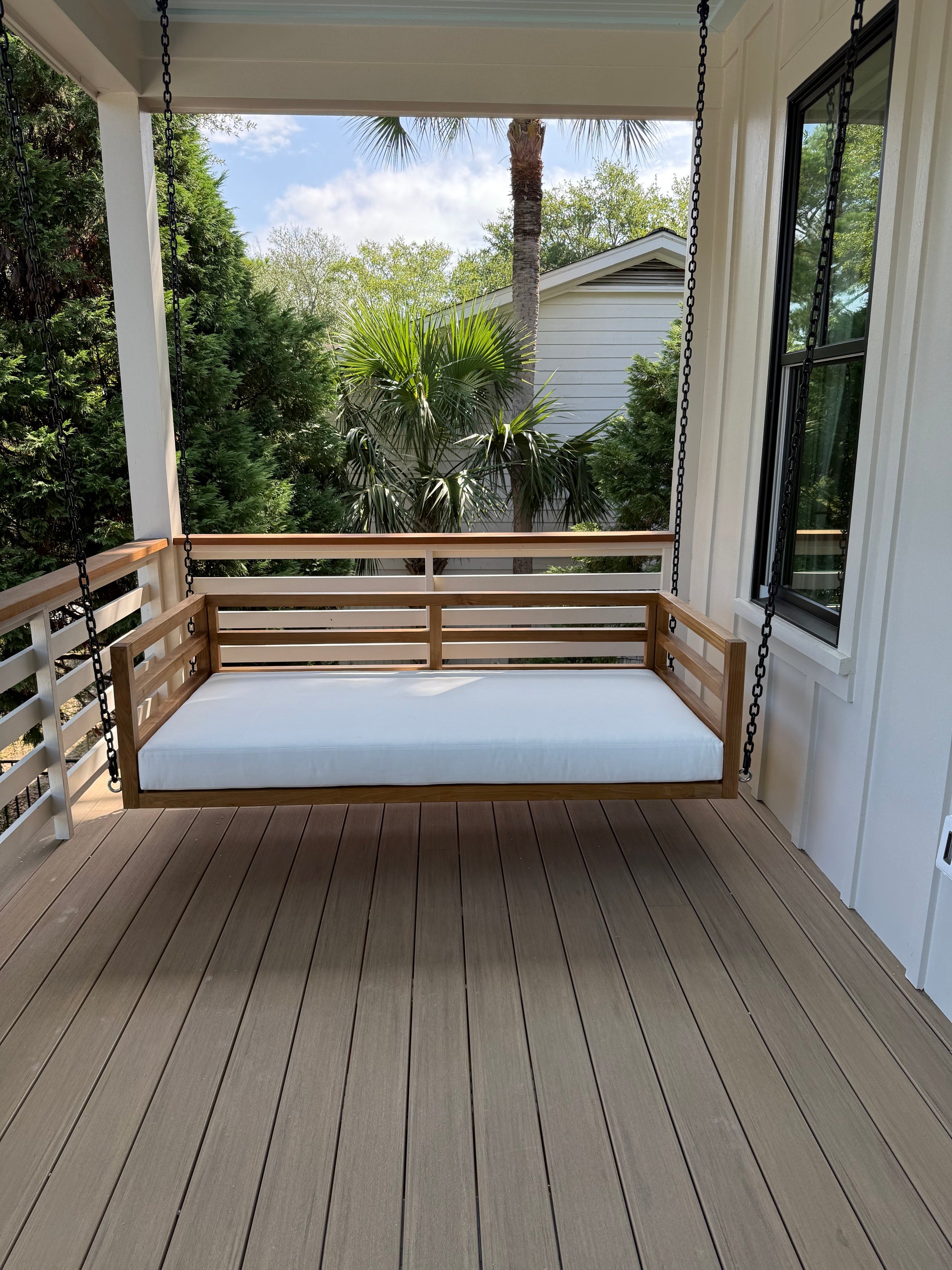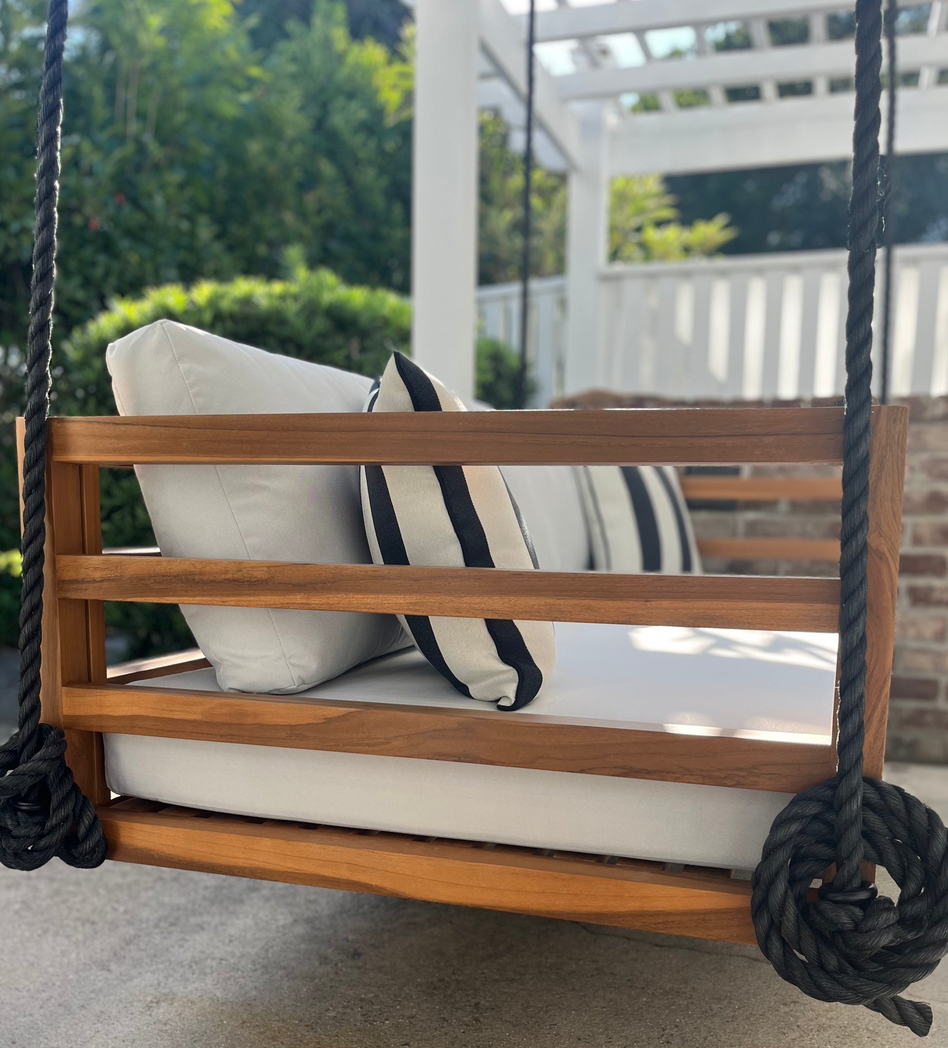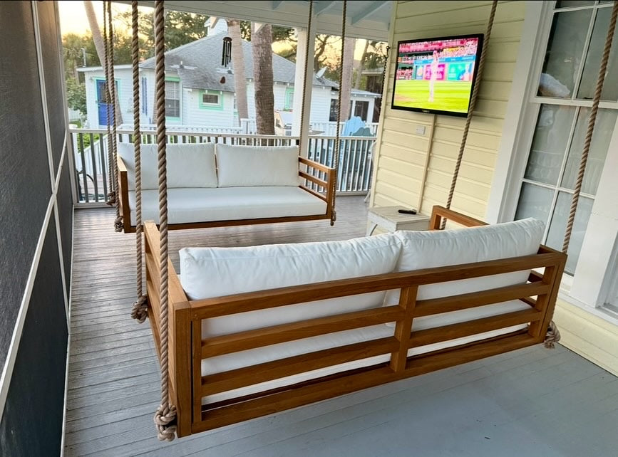 Built from premium-grade teak, The Del Mar is designed to withstand the elements while providing a sleek, elevated aesthetic. Each swing bed comes as The Whole Package: teak frame, tailored cushions, and a 1-Inch Manila Rope + Hardware Kit.