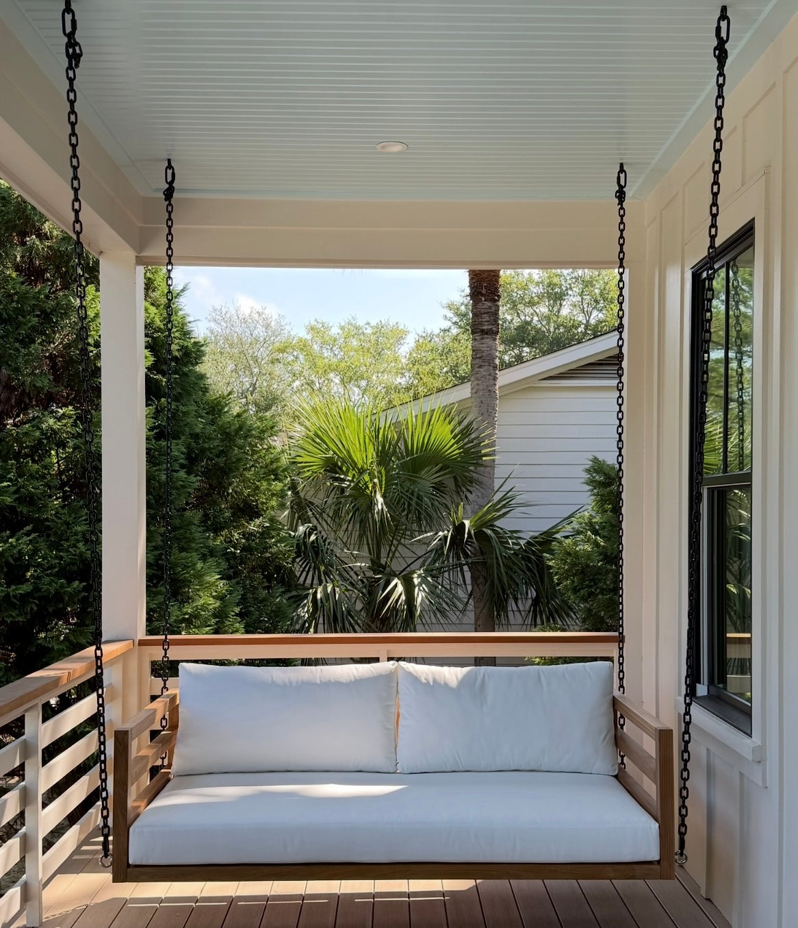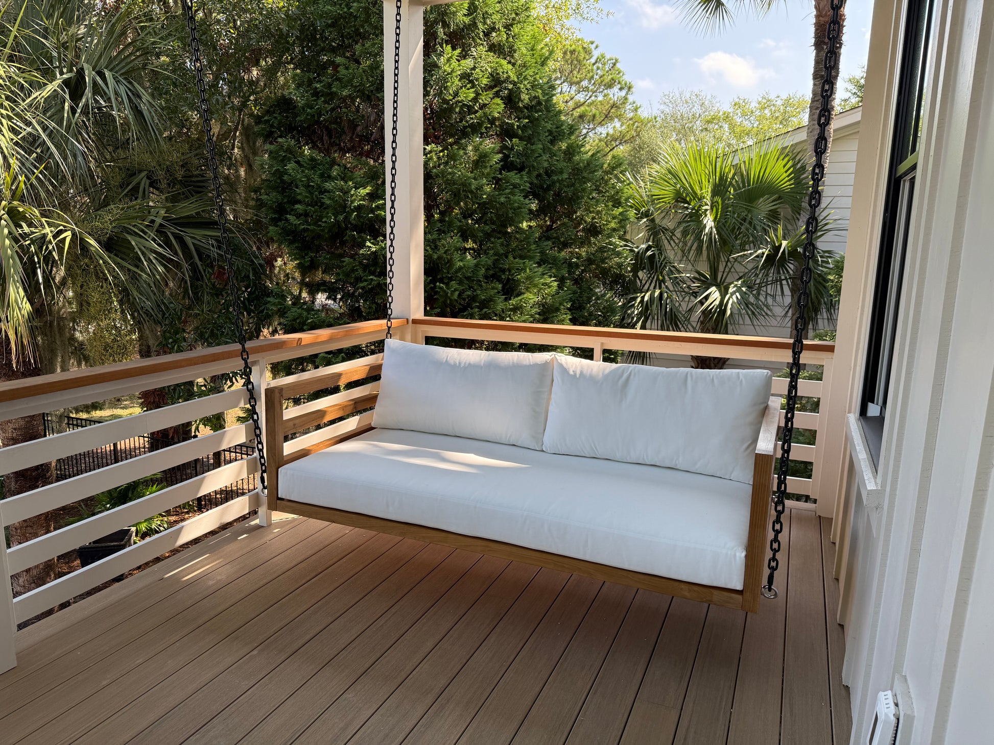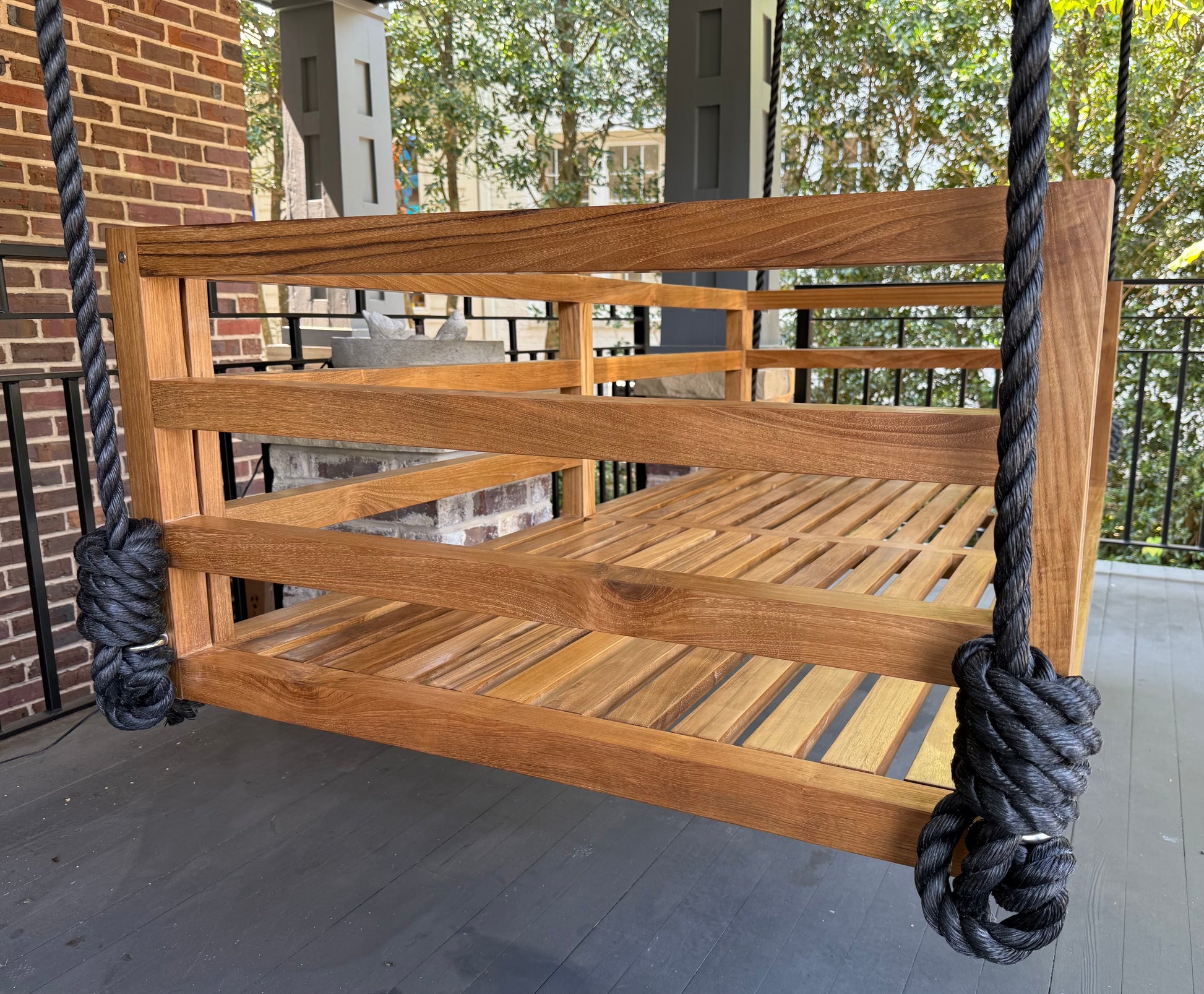 Built from premium-grade teak, The Del Mar is designed to withstand the elements while providing a sleek, elevated aesthetic. Each swing bed comes as The Whole Package: teak frame, tailored cushions, and a 1-Inch Manila Rope + Hardware Kit.